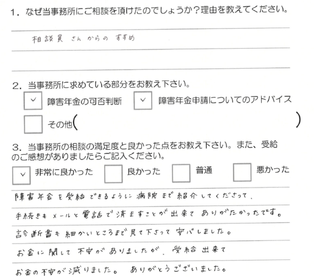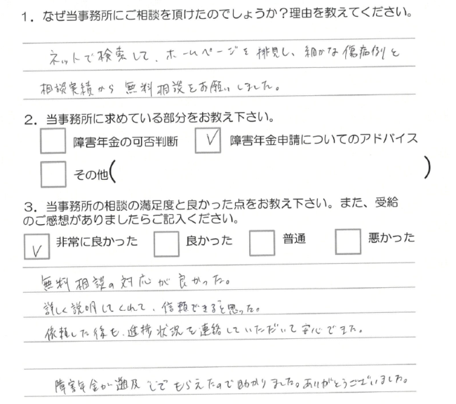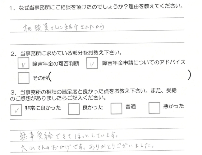 障害年金についていろいろと指導して頂き、結果受給することが出来ました。