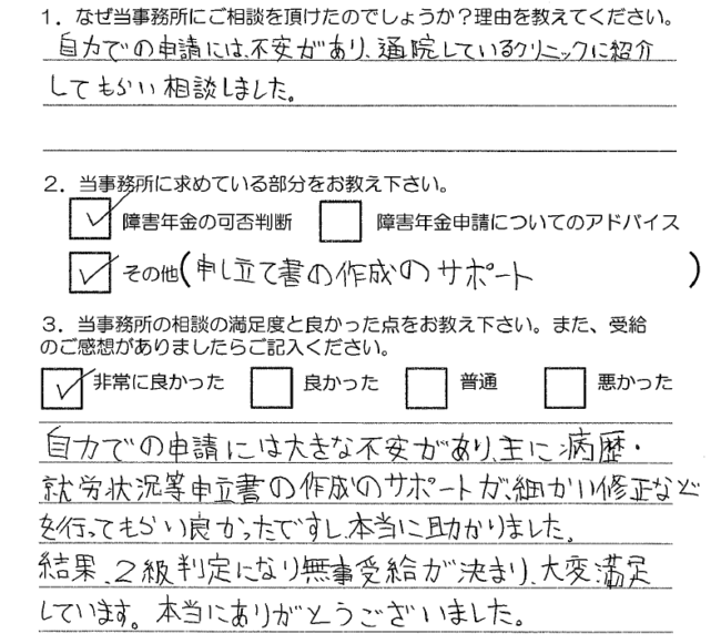 結果、2級判定になり無事受給が決まり大変満足しています。本当にありがとうございました。