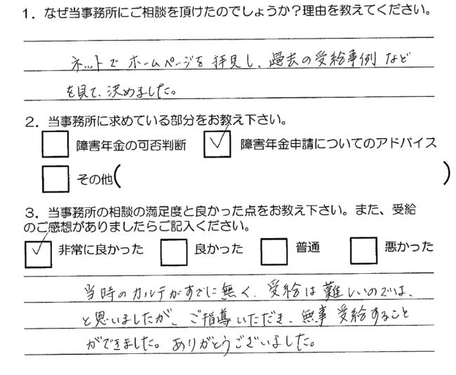 当時のカルテはすでに無く、受給は難しいのでは、と思いましたが、ご指導いただき、無事受給することができました。ありがとうございました。
