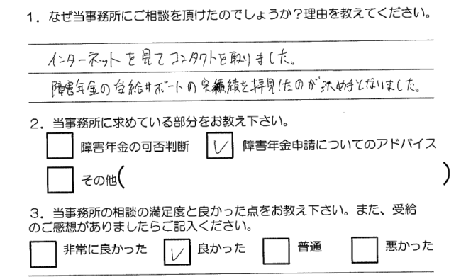 障害年金の受給サポートの実績を拝見したのが決め手となりました。